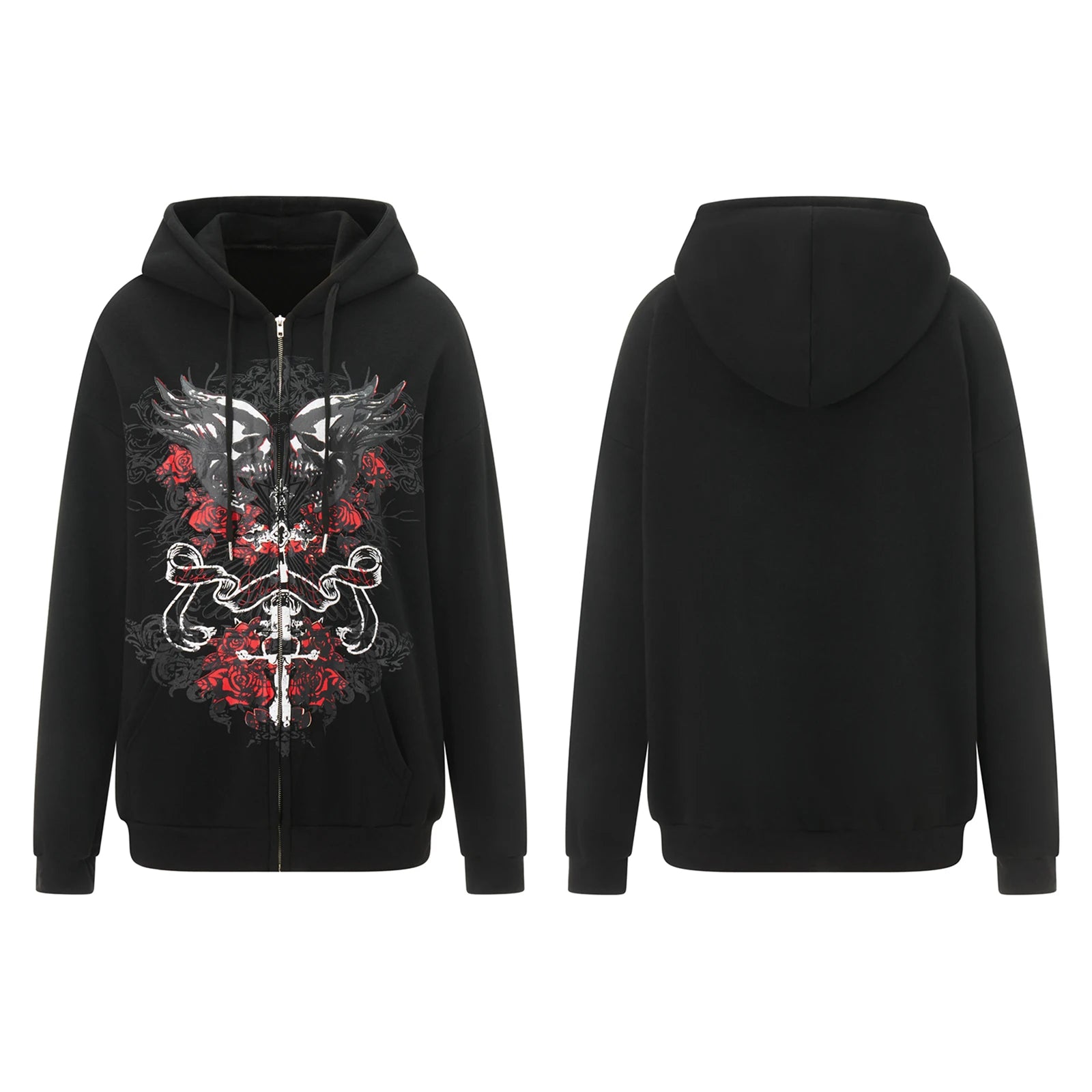 Combhasaki Women Y2K Vintage Grunge Gothic Loose Coat Long Sleeve Skull Print Sweatshirt Outwear with Pocket Jacket with Zipper